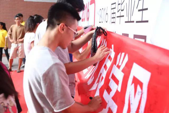 在场全体同学踊跃在条幅上签下自己的名字,表达了诚信考试的决心。
